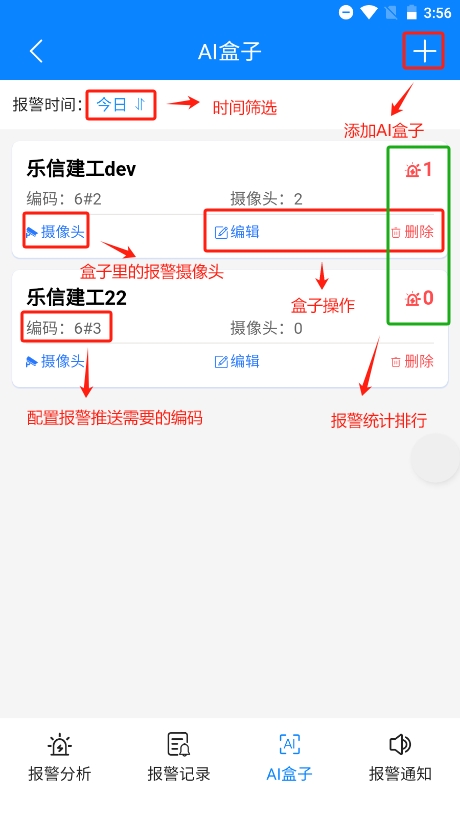 AI盒子决定了报警数据来源,本系统添加盒子后会生成唯一的“盒子编码”,必须使用该盒子编码到设备盒子配套的“人工智能推理平台”配置“报警推送”,然后才能接收到设备盒子的报警数据。之后可以查看盒子报警摄像头,以及报警记录统计,点击AI盒子可以查看当前点击的AI盒子相关的报警分析。