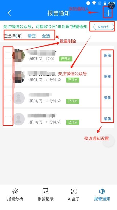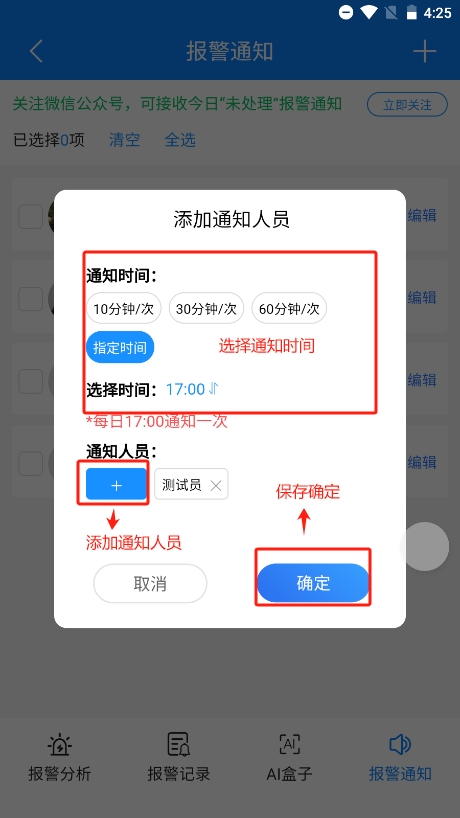 添加通知人员之后,通知人员即可在本系统配套的“微信小程序”内快速查看并处理报警。通知人员关注乐信建工微信公众号后,可以接收当日报警通知,快速跳转小程序查看处理报警,通知人在小程序内可以自行修改通知设置。