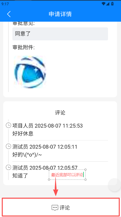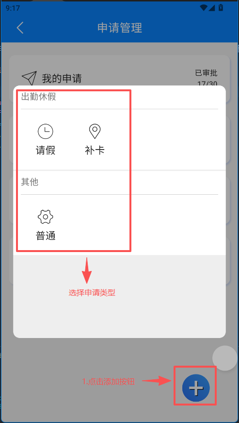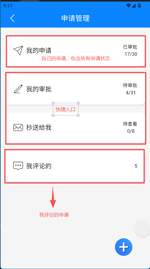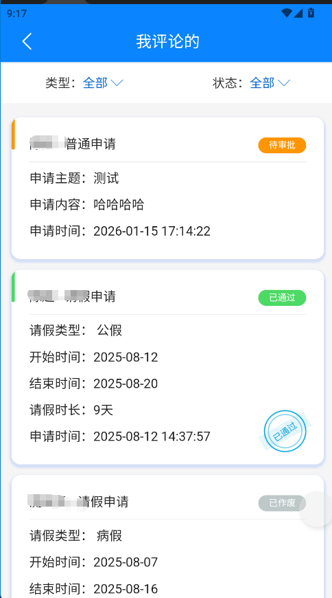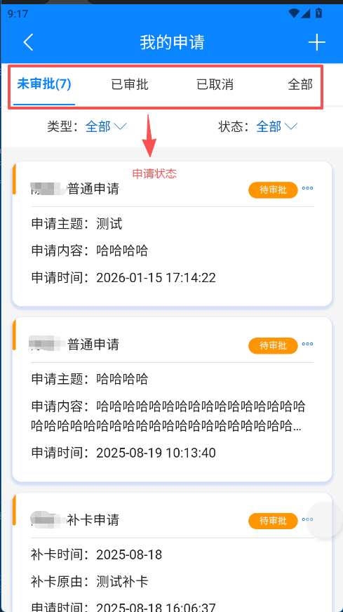 申请管理包含请假申请、补卡申请和其它申请。可以查看我的申请、我的审批、抄送给我和我的评论。
