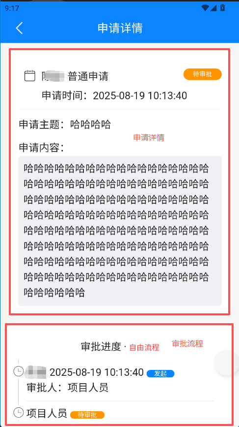 我的申请包含请假申请、补卡申请和其它申请,所有申请记录都可查看。查看是否审批,审批结果等。