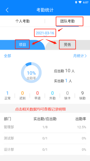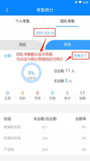 团队考勤统计仅APP端项目人员可见