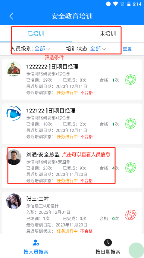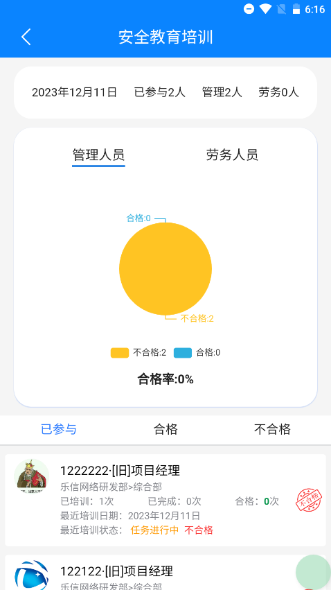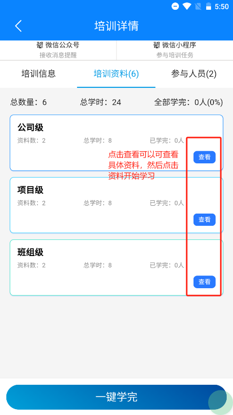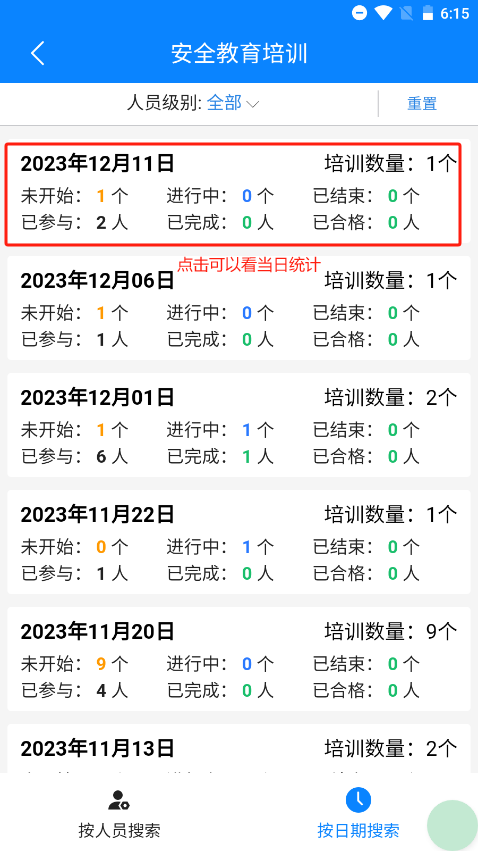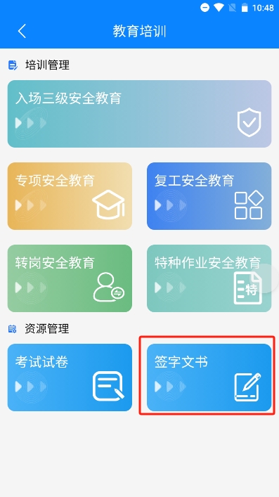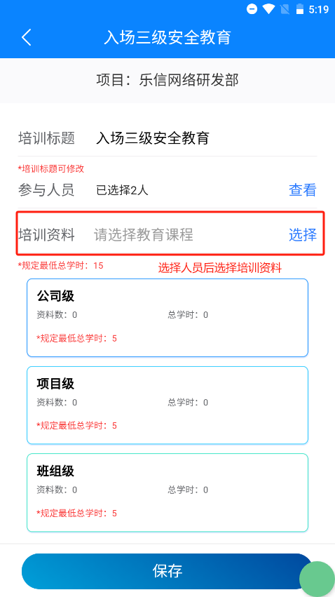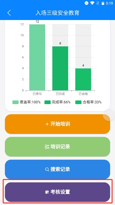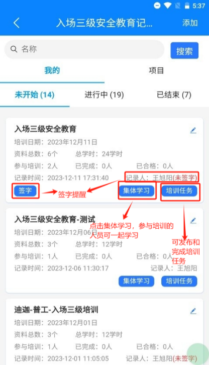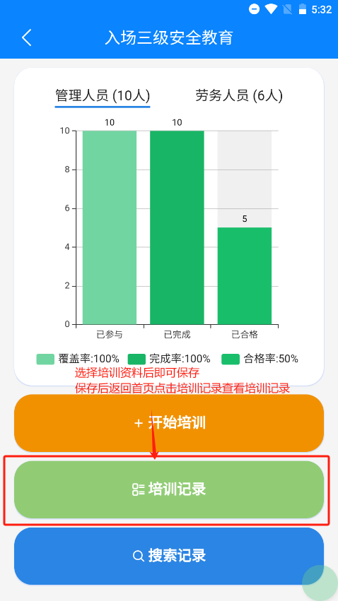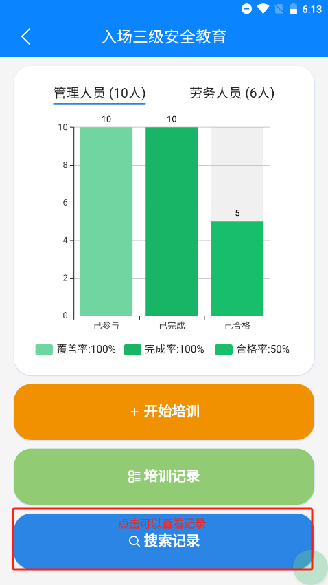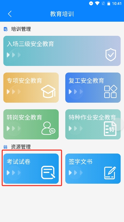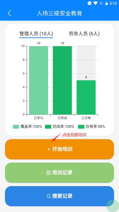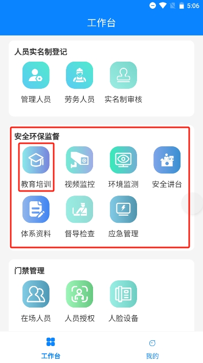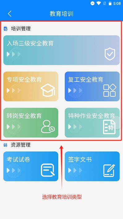 首页点击安全教育培训,即可进入安全教育培训首页,安全教育目前共5种,后续操作以入场三级为例