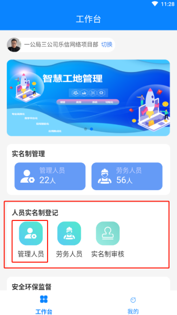 点击首页“人员实名制登记”下的“管理人员”,进入页面后点击右上角“+”按钮,同时在页面也有新增/修改部门的入口
