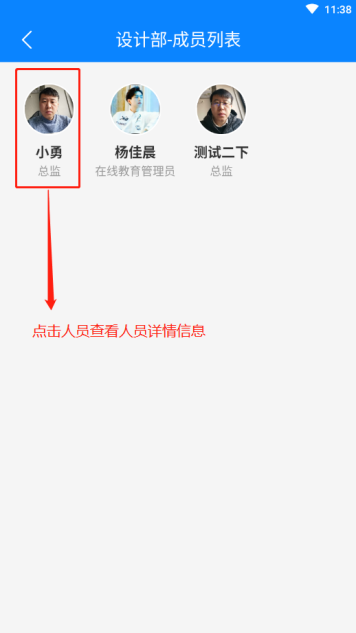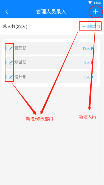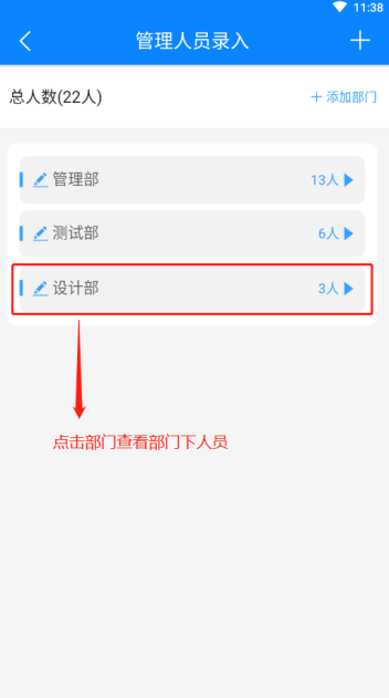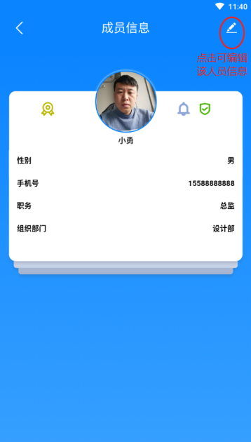 新增人员保存后回到管理人员录入主页,可点击部门查看部门下的人员,点击单个人员可查看该人员详情信息,点击右上角“编辑”图标可修改该人员信息