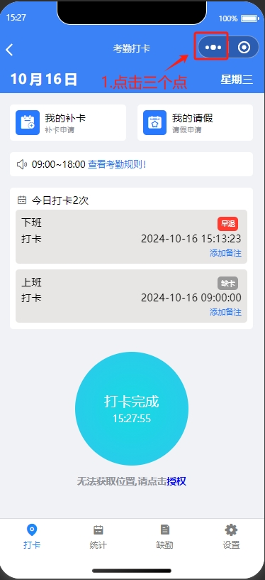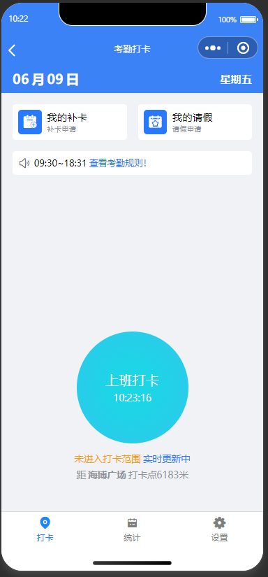 点击首页【考勤打卡】进入,考勤打卡包含三个模块,打卡、统计和设置。其中打卡模块还包含了补卡和请假,打卡需要提前设置考勤规则,考勤规则是在app端进行设置 APP考勤规则设置