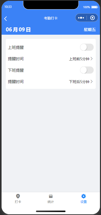 考勤设置只要打开提醒,就会收到微信公众号通知,前提是关注公众号并绑定