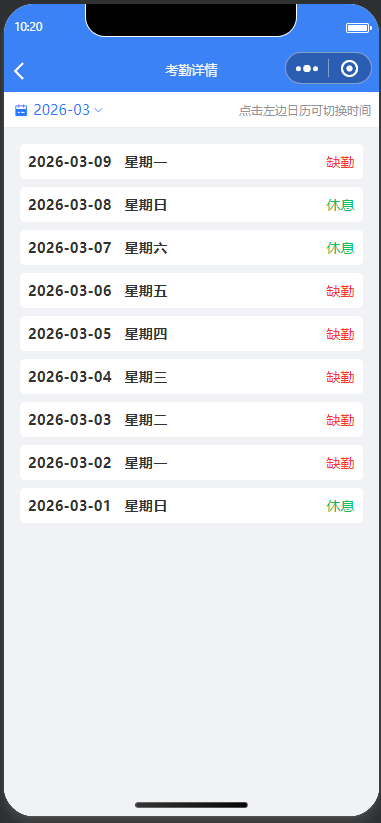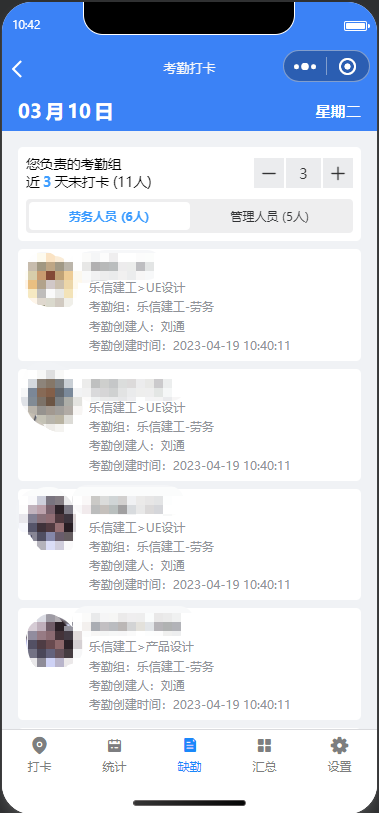 项目人员可以查看负责的考勤组人员缺勤情况