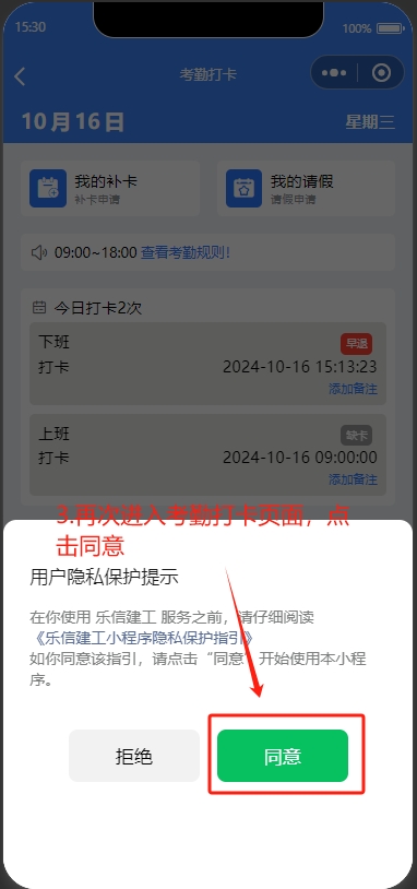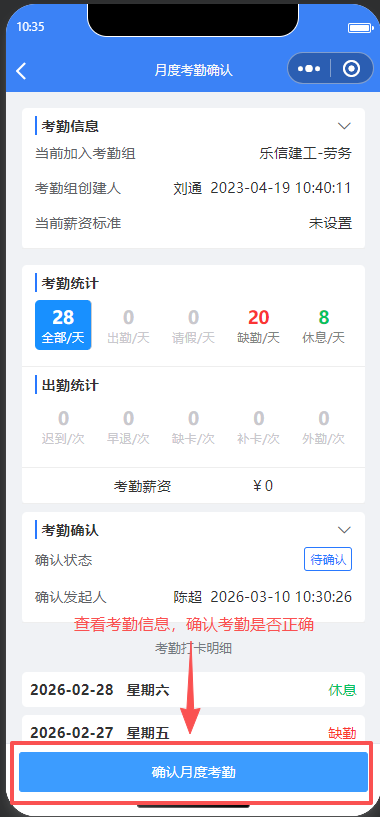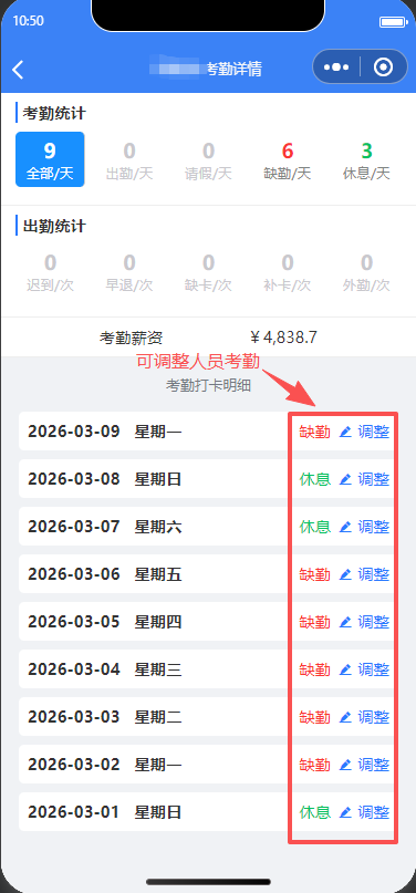 班组长可以查看班组下所有班组人员的考勤情况,并且可以调整考勤状态