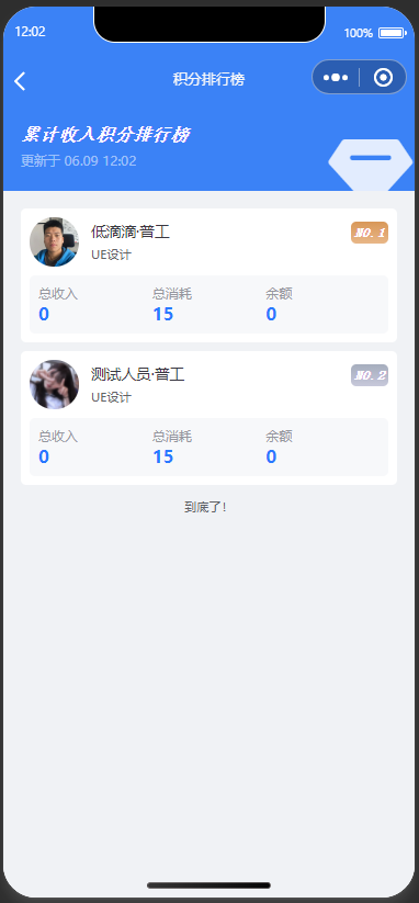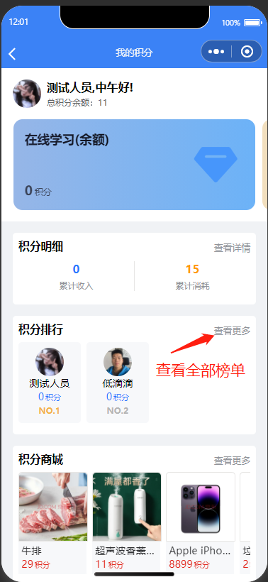 积分排行是每个人的收入排行榜,详情里面可以查看总收入、总消耗和余额积分