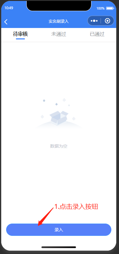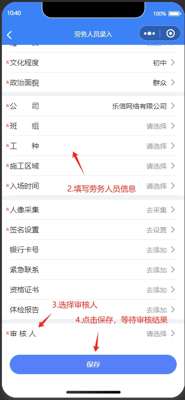 点击首页【实名制录入】进入,待审核里面就有已提交需要审核的劳务人员列表,点击列表可以查看劳务人员详细信息,审核进度。审核完成之后可以通过切换状态查看审核结果。下面是劳务人员录入的操作步骤: