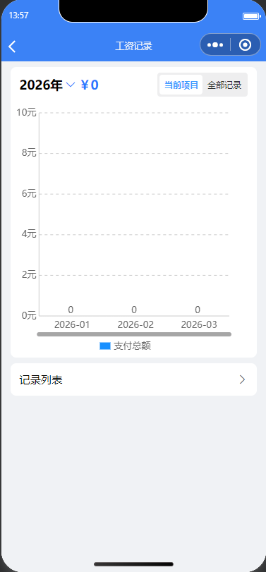 也可以在【我的】页面【工资记录】中查看工资统计和相关信息。