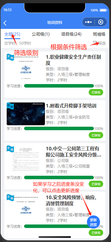 发布培训之后就可以从这边进行学习,点个每个级别进行学习,学完之后就可以进行考试和签字了