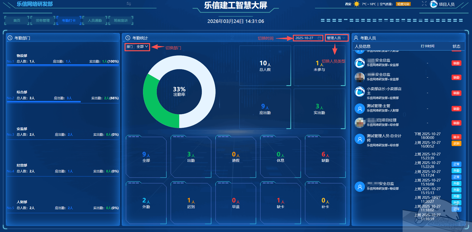 考勤打卡展示了各部门打卡人数情况,考勤统计了具体某一天的数据,和考勤人员情况。