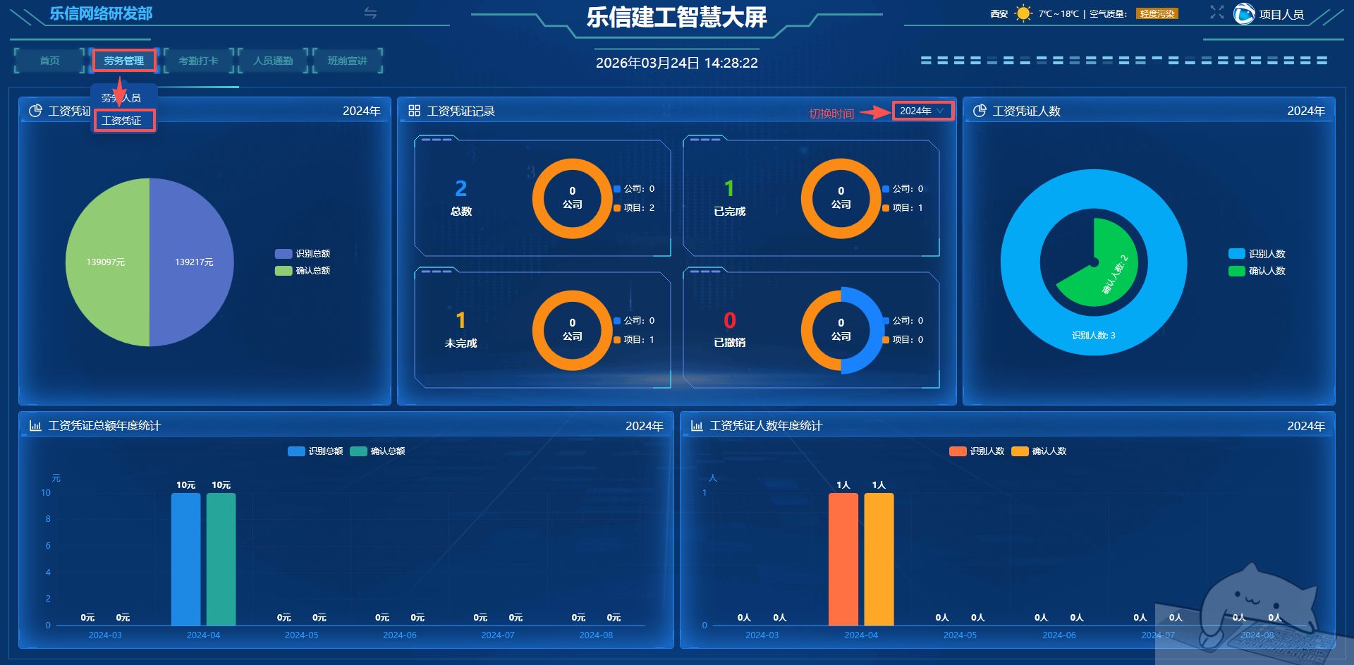 工资凭证展示了工资凭证总额、工资凭证人数、工资凭证总额年度统计和工资凭证人数年度统计等数据。
