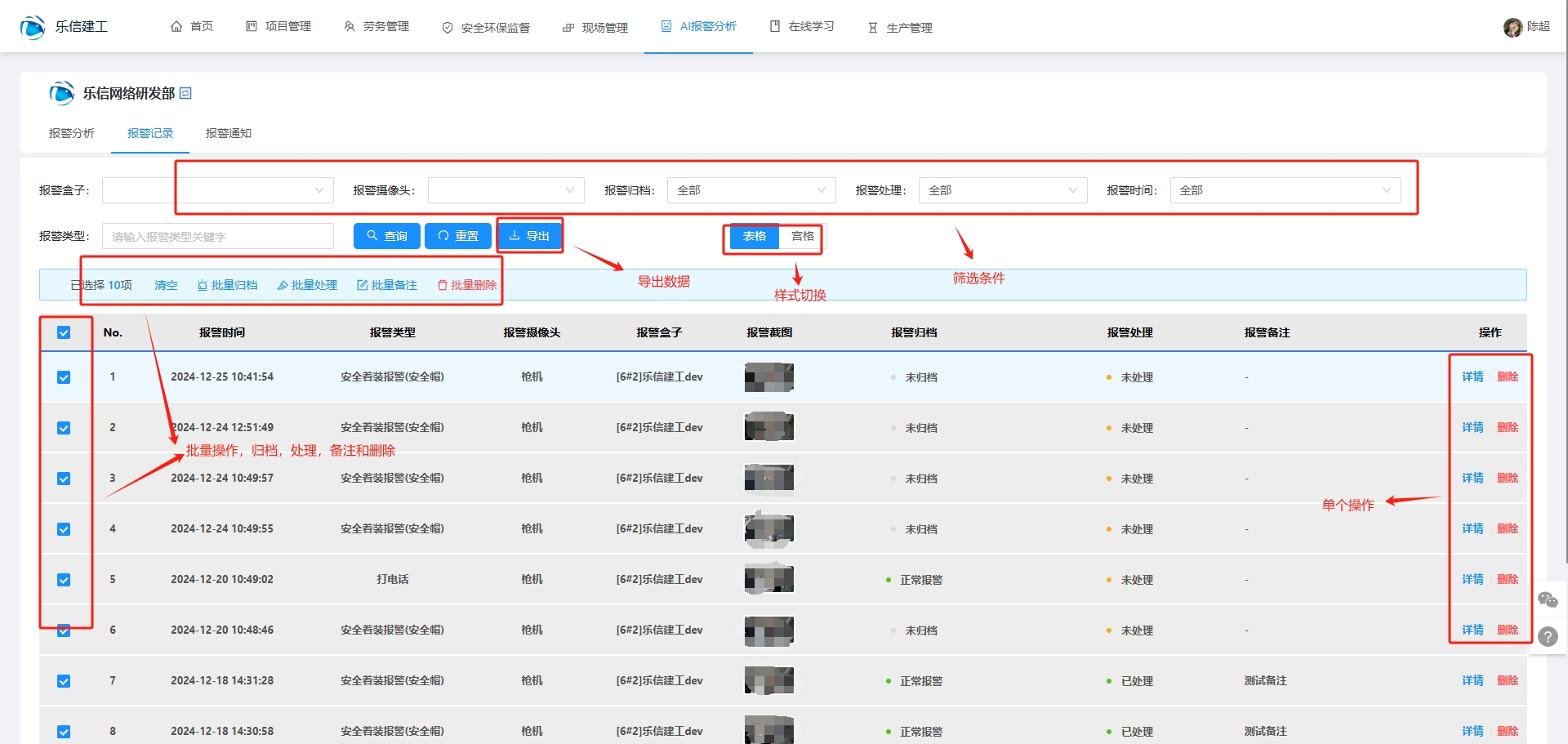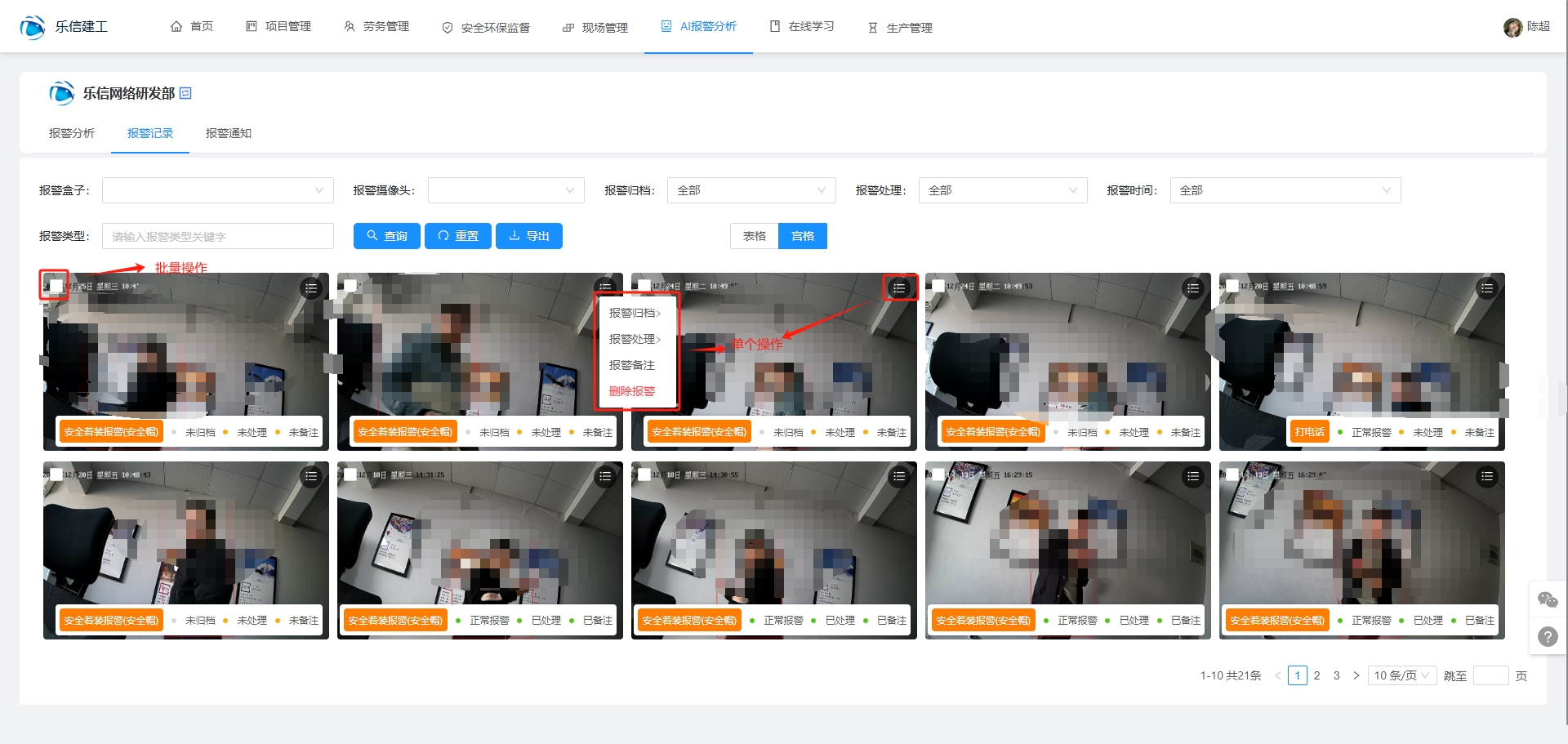 报警记录支持表格和宫格两种展示方式,可以筛选,归档,处理,导出报警记录。