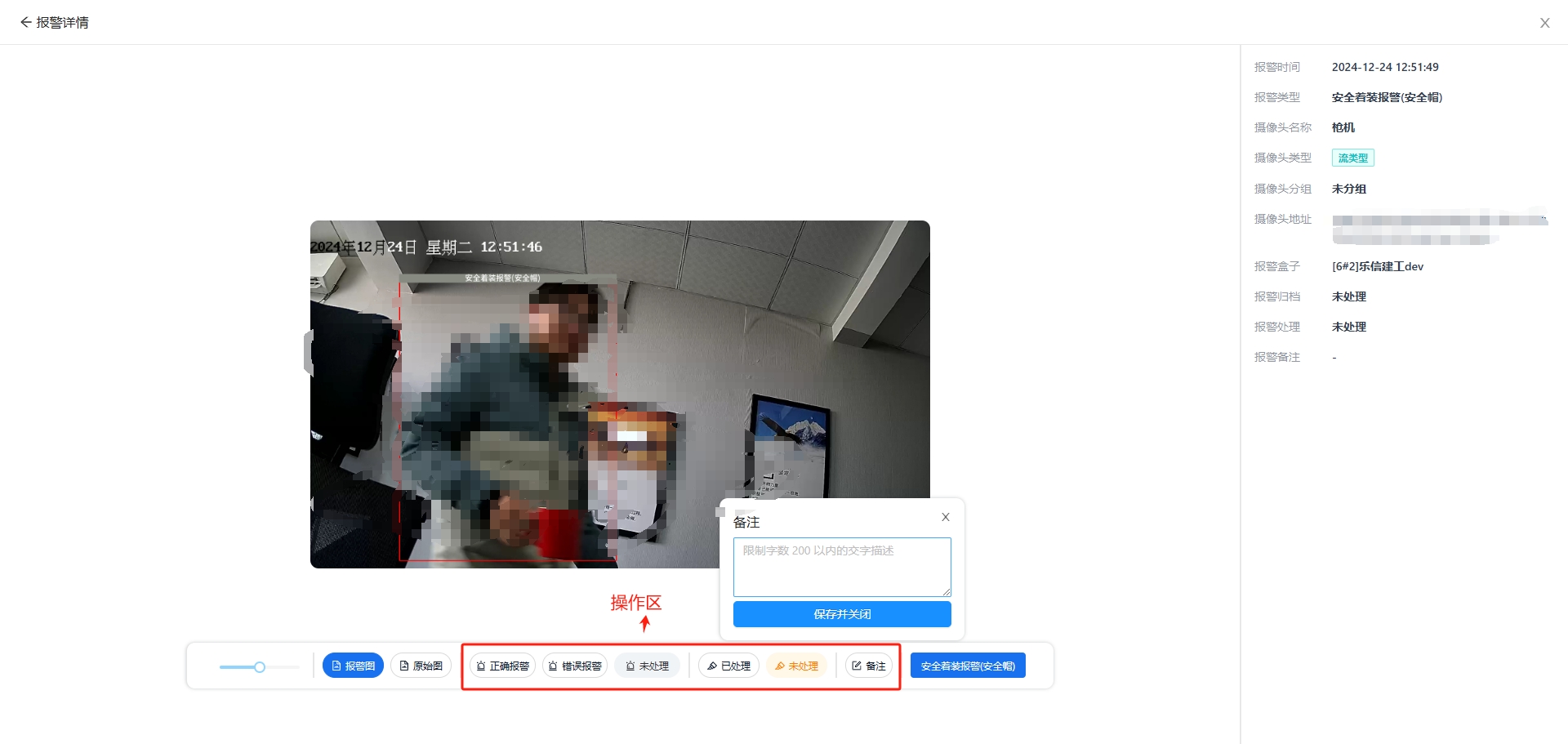 本系统报警数据由AI盒子设备“单向推送”,因此,在本系统对报警记录的归档、处理仅在本系统优效,无法同步到AI盒子设备配套的系统中。