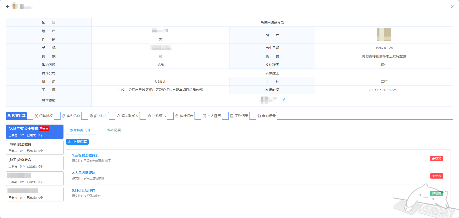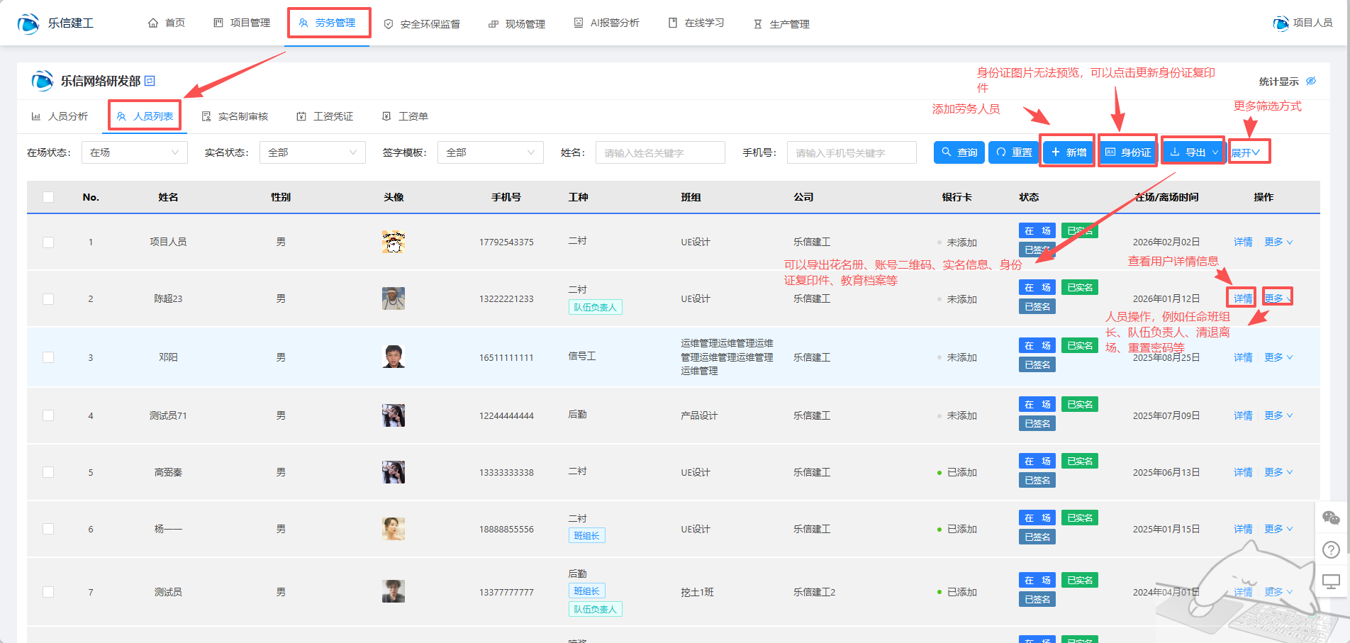 可以查看项目下所有劳务人员的信息,对劳务人员可以继续添加、任命、离场等操作。下面是具体功能介绍: