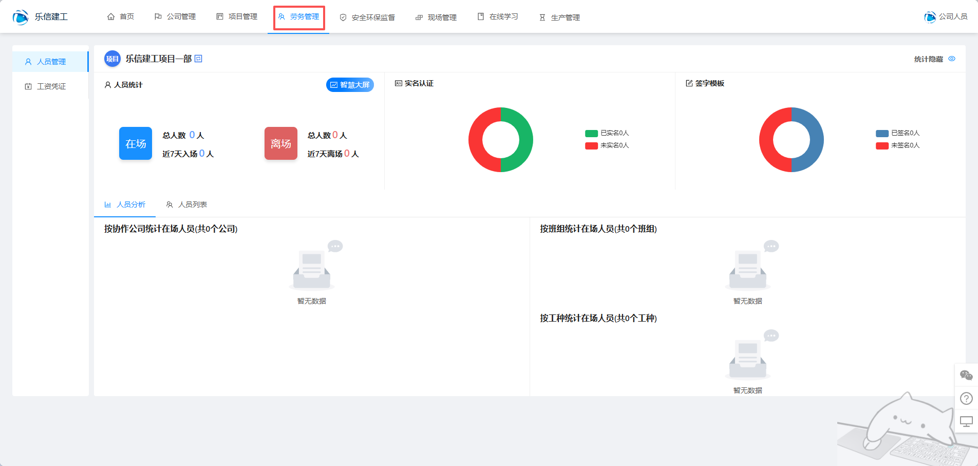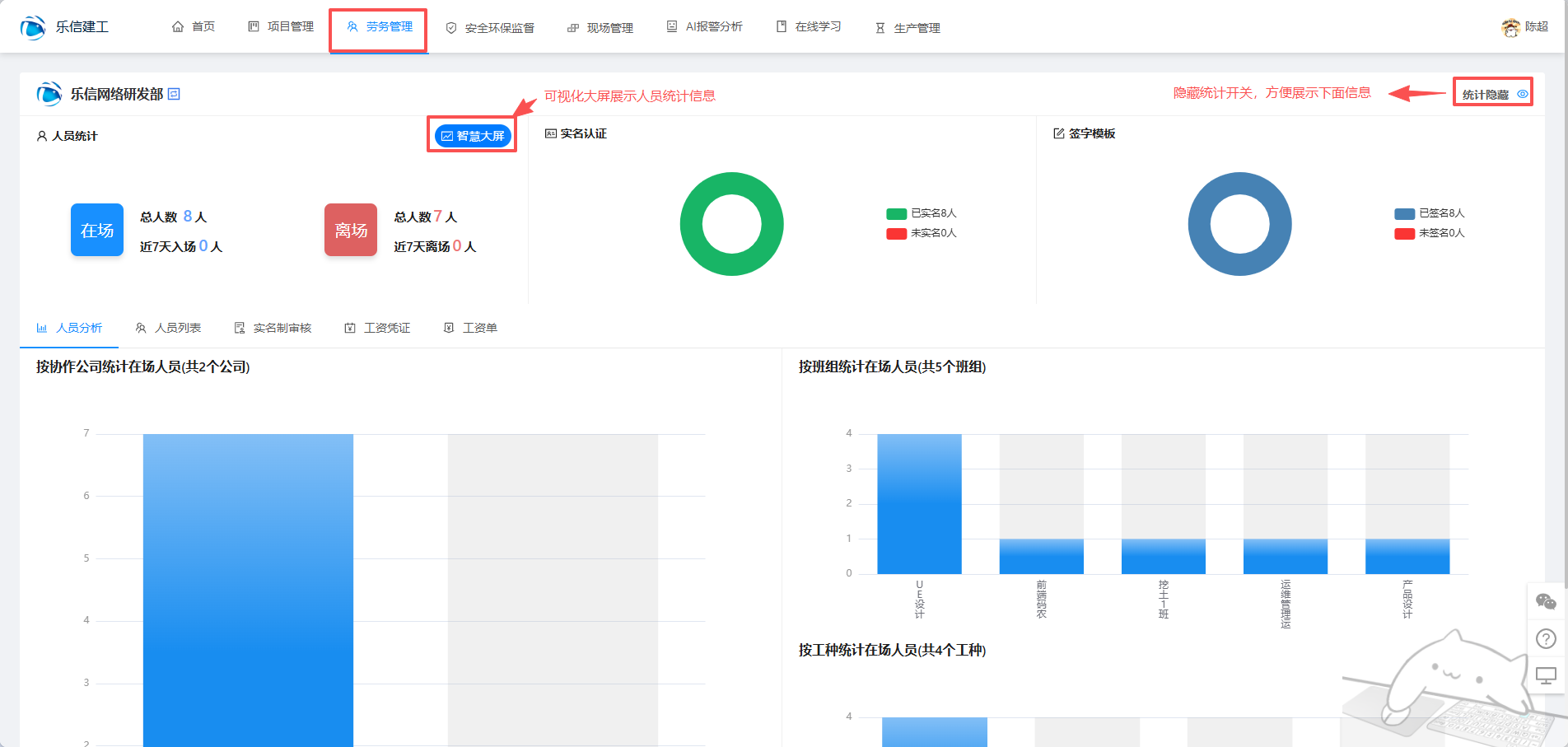 项目人员进来就可以看到项目下面的人员统计信息,包含人员统计、实名统计和签字模板统计,右上角可以切换项目继续查看其他项目的统计信息,左上角是隐藏统计开关,为了方便展示更多劳务管理功能的信息。