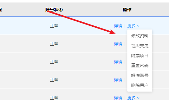 点击详情可查看人员详情--包含人员信息、教育档案、实名信息、银行卡、门禁授权等。 点击更多可对管理人员进行一系列操作