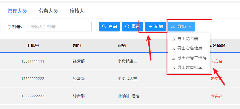 在此处可添加管理人员,按照部门导出管理人员花名册、实名信息、二维码、教育档案等
