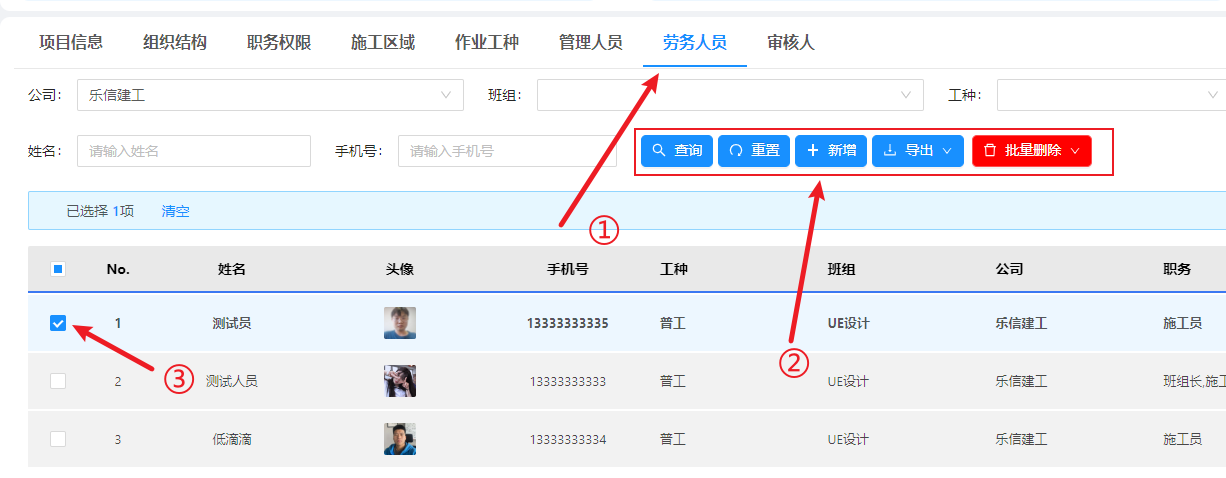 点击①进入劳务人员页面,②处可对劳务人员进行查询、新增、导出等操作。点击③后可多选批量删除劳务人员