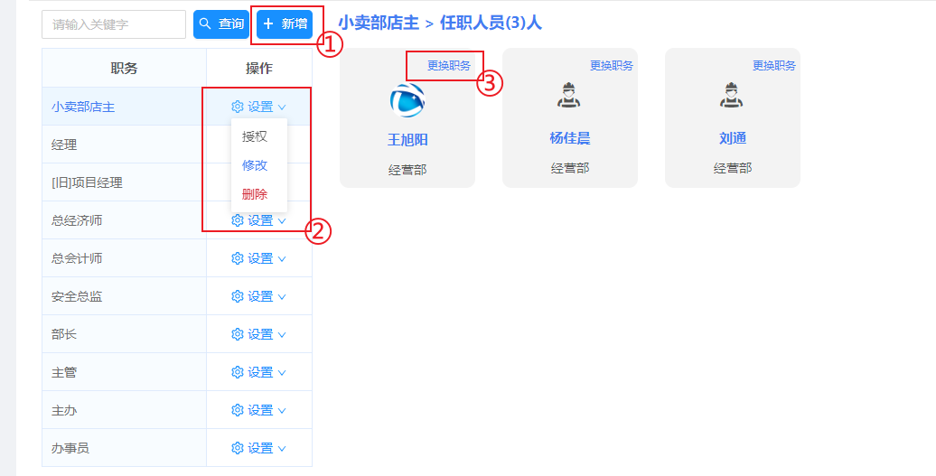 查看当前选择职务下的人员列表,点击①可新增职务,点击②对已有职务进行授权、修改、删除操作,点击③可快速更换人员职务。