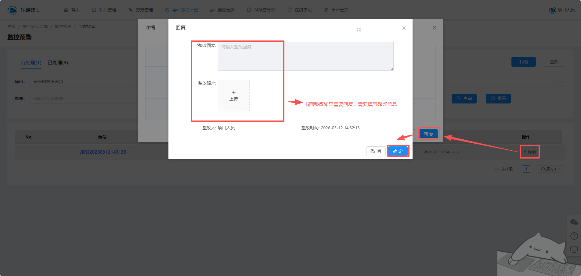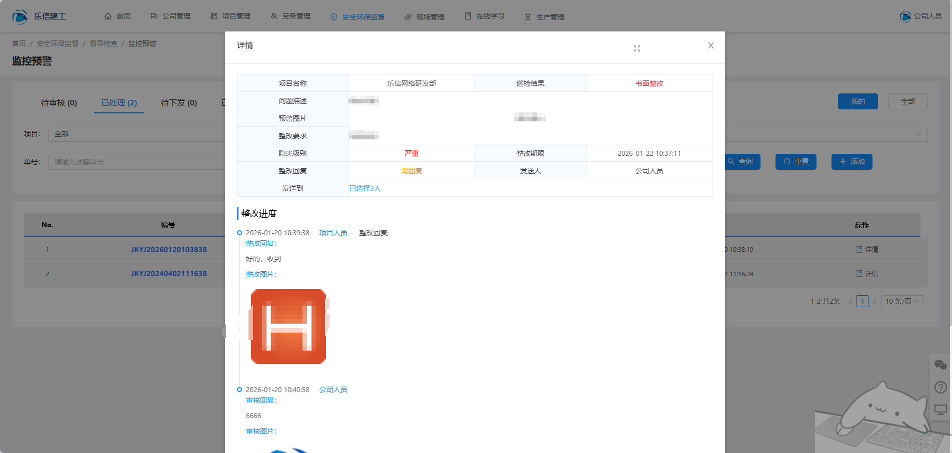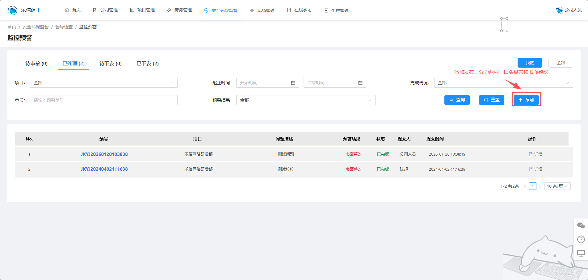 监控预警只有公司级人员发布预警,项目级人员查看预警,并且做出对应的整改。