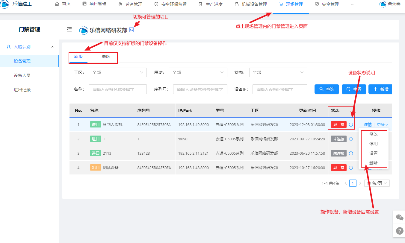 进入门禁管理后可新增修改设备等