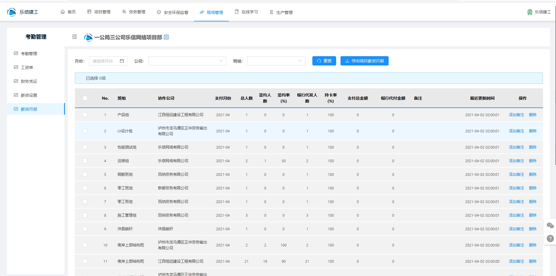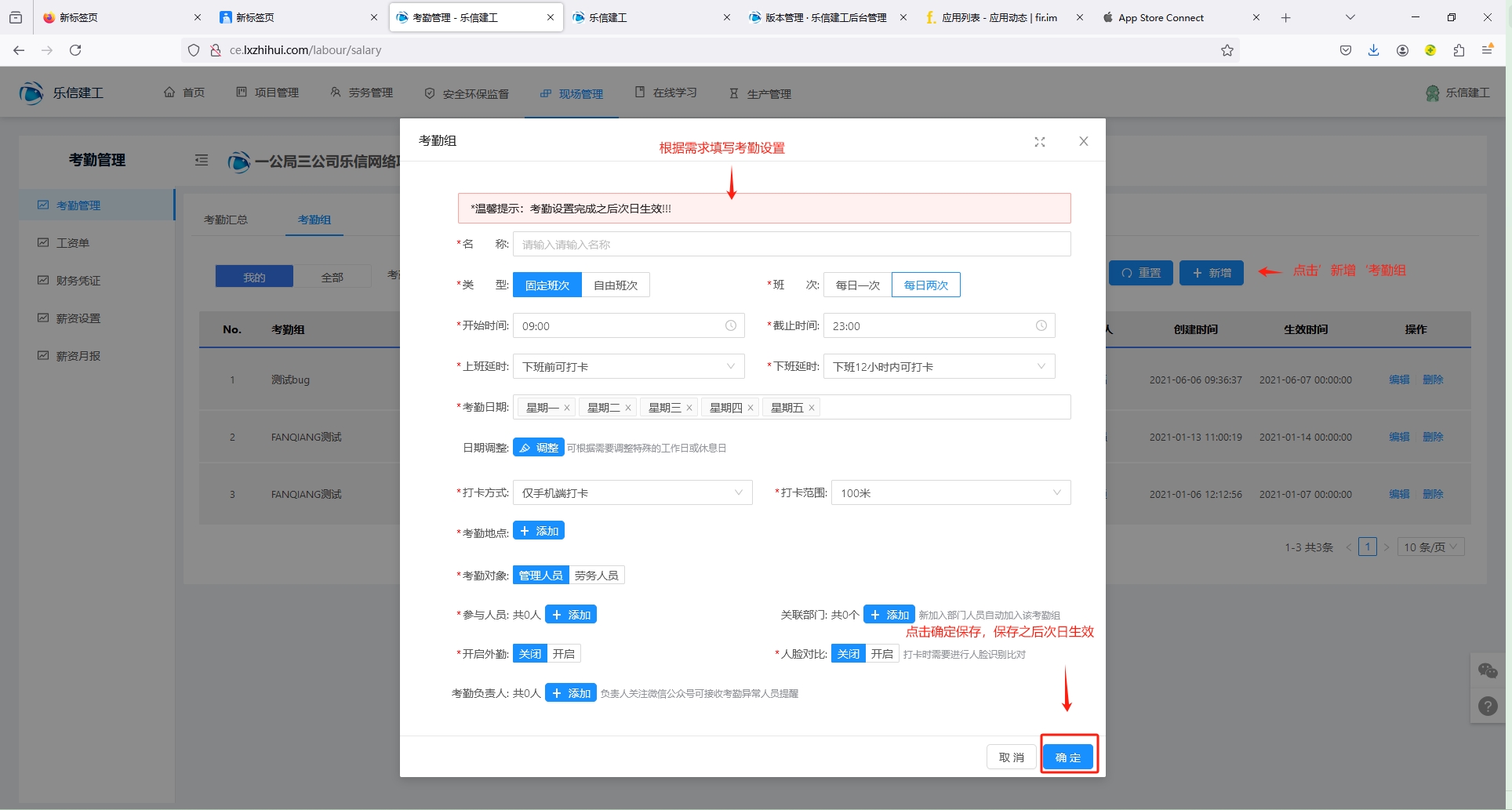 考勤管理包含管理人员和劳务人员考勤汇总,设置考勤组,设置考勤规则。